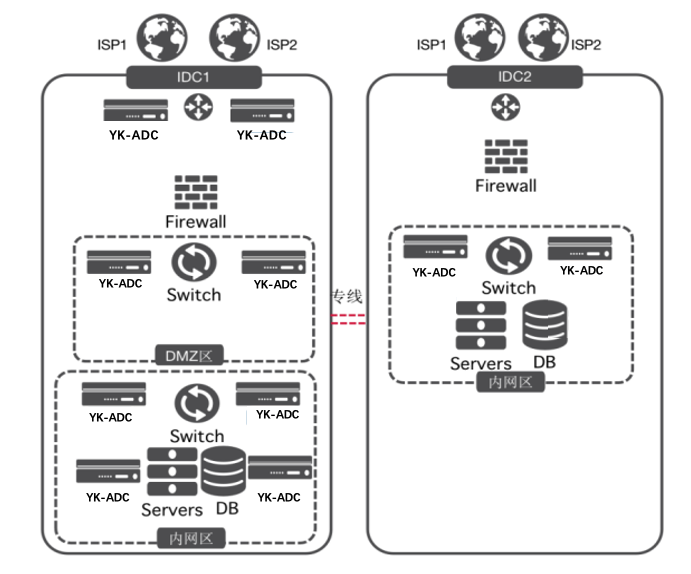 3、內網(wǎng)采用YK-ADC的RHI+OSPF和集群技術(shù),做到IP架構的雙中心雙活應用調度