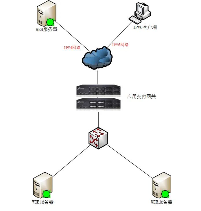 參見(jiàn)如下的網(wǎng)絡(luò )邏輯示意圖,應?交付控制器作為 IPv6 和 IPv4 的協(xié)議網(wǎng)關(guān)來(lái)部署,同時(shí)提供數據中心 Web 應用服務(wù)器集群的負載均衡等應用交付的功能。數據中心內部的應用程序還沒(méi)有經(jīng)過(guò) IPv6 的改造,依然是 IPv4 的環(huán)境,應用交付控制器分別連接 IPv6 和 IPv4 兩個(gè)網(wǎng)絡(luò ),通過(guò)虛擬服務(wù)器方式將數據中心的 Web 應用發(fā)布在 IPv6 的網(wǎng)絡(luò )中(圖中以虛擬服務(wù)器vs_main: 2017:1::158:80 對 IPv6 的客戶(hù)端發(fā)布),IPv6 網(wǎng)絡(luò )中的客戶(hù)端可以訪(fǎng)問(wèn)應用交付網(wǎng)關(guān)發(fā)布的 IPv6 的虛擬服務(wù)器,通過(guò)代理的方式將請求轉發(fā)給數據中心內部的真實(shí)服務(wù)器,得到響應內容之后將返回的內容再轉換成 IPv6 數據包返給客戶(hù)端,從而保證客戶(hù)端能夠在?個(gè) IPv6 的網(wǎng)絡(luò )中訪(fǎng)問(wèn)數據中心 IPv4 的應用。