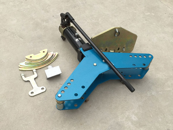 b、平彎時(shí)打開上花扳將夾板模頭部裝進(jìn)工作油缸頭,根據(jù)所彎排的厚度,R,選擇R模板與鋁排或銅排一起放進(jìn)夾板模頭中,然后壓緊夾板,將兩只輥柱(6)的槽寬對(duì)應(yīng)向著鋁排和銅排厚度,并且放入相應(yīng)的尺寸孔中,再將上花板蓋上,把所彎鋁排或銅排頂入槽中,但排須伸出輥柱100mm以上,如如果超過200mm以上,可接長(zhǎng)頂桿—頭套進(jìn)工作油缸頭部,另一頭裝進(jìn)夾板模頭仍可操作。